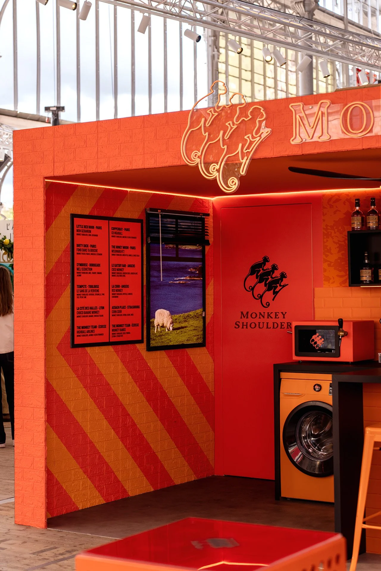 Le design intègre des touches de branding Monkey Shoulder pour renforcer l'identité de la marque mais également des becs pressions cachés dans le décor pour offrir 12 cocktails on-tap imaginés par des bars partenaires.